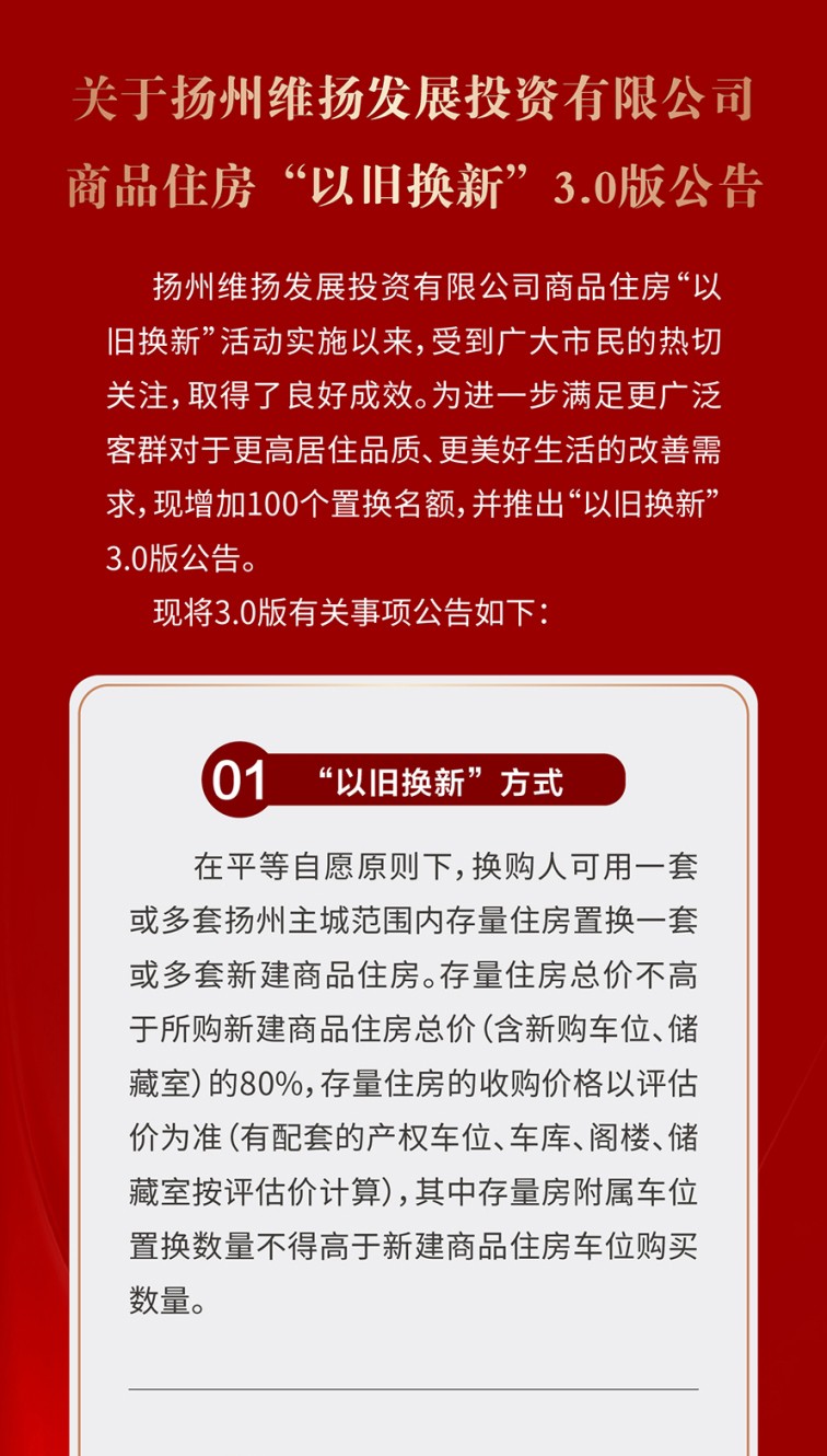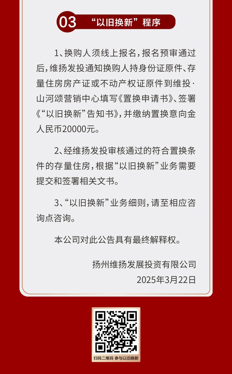 為進(jìn)一步滿足更廣泛客群對(duì)于更高居住品質(zhì)、更美好生活的改善需求,維投地產(chǎn)公布了“以舊換新”3.0版本,將維投·山河序也納入置換范圍,預(yù)計(jì)本周五(5月23日)正式啟動(dòng)置換流程,同時(shí)接受預(yù)約登記。